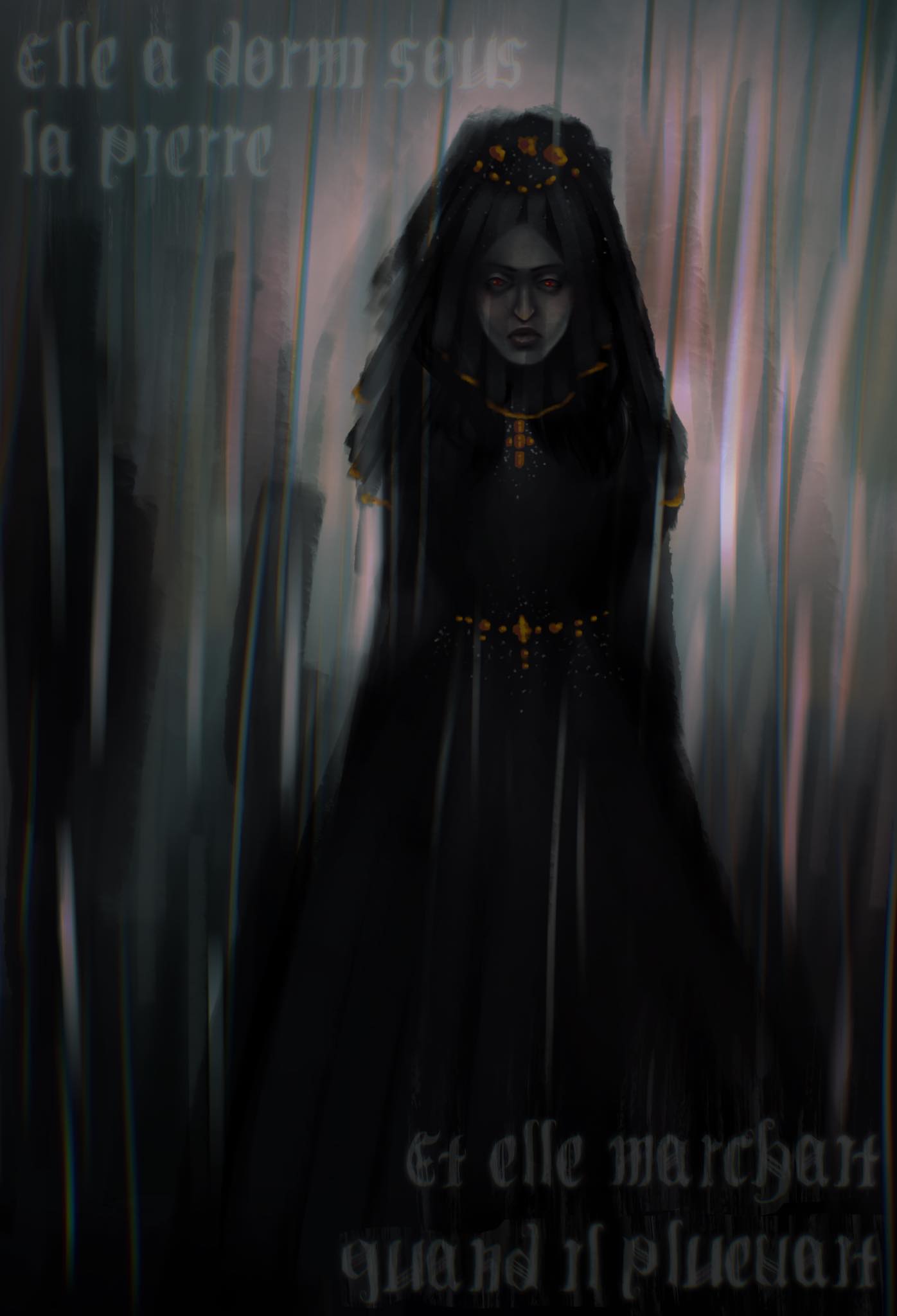 A woman in black stares through the rain