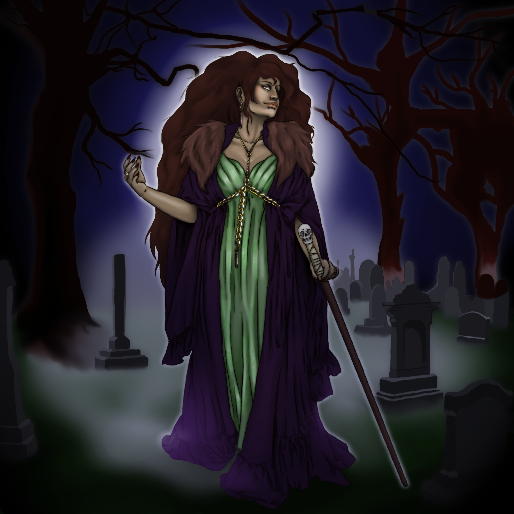 Morgana stands in a graveyard late at night